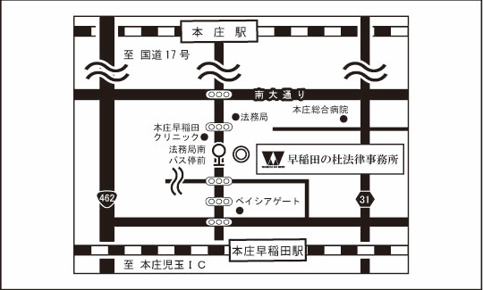 県道86号線「本庄早稲田駅前」を左折、信号2つ目を先へ法務局手前